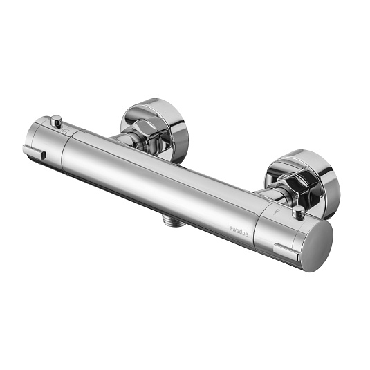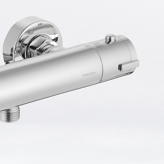 Термостат для душа Сведби Меркури/Swedbe Mercury — надёжный смеситель от шведского бренда Swedbe. Оснащён «умным» картриджем. Благодаря обратным клапанам решается проблема «выдавливания» холодной воды горячей из-за разницы давления, когда температуру воды отрегулировать невозможно. Клапаны чётко разделяют холодную и горячую воду, исключая подмес. Это важно в тех домах, где есть сильная разница давления в стояках. В моделе предусмотрен ограничитель температуры, предустановленный на отметке 38 градусов, что считается идеальным значением для комфортного мытья. Можно не бояться обжечься при повороте рукоятки температуры, что актуально для семей с маленькими детьми.